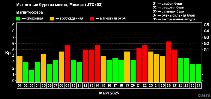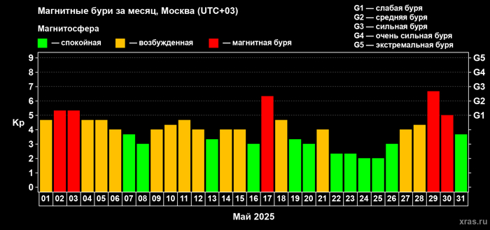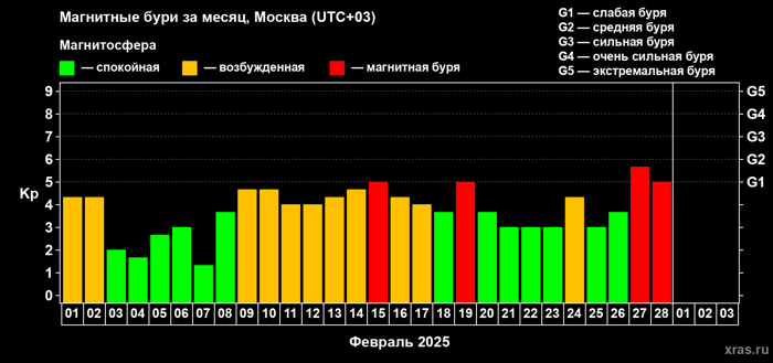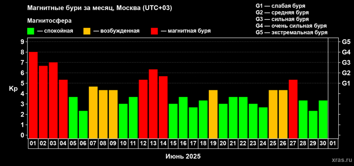 В последующие 182 дня первого полугодия геомагнитная обстановка планеты была такова: При этом с каждым последующим месяцем отмечается возрастание возмущения магнитосферы Земли. А 01 января, 16 апреля и 01июня сила магнитных бурь достигал критического уровня G4.