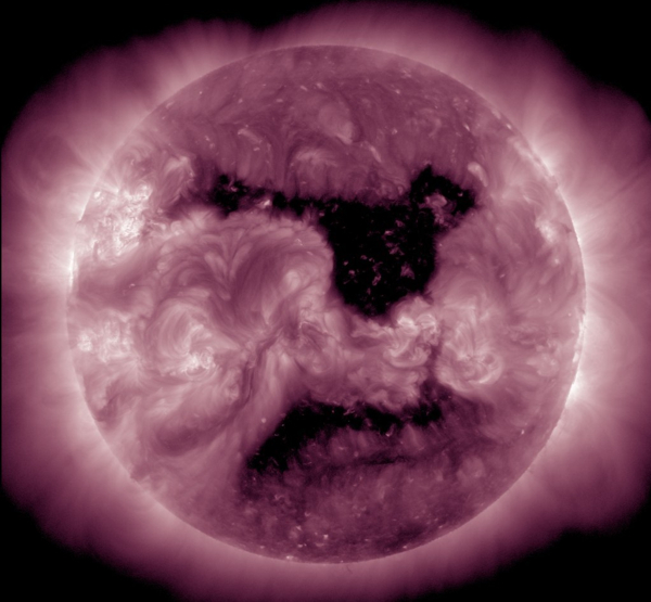 Не так часто удается увидеть, как из ничего рождается корональная дыра размером с половину Солнца. Объект сформировался в южном полушарии Солнца и по этой причине потоки быстрого солнечного ветра "цепляют" Землю верхним краем дыры, но даже этого хватает для магнитных бурь.