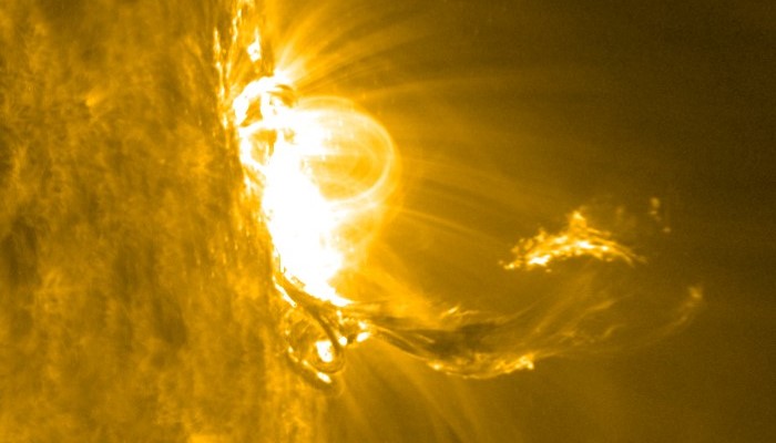 На видео видны достаточно стандартные плазменные структуры, а также характерные для выбросов разрывы магнитных петель и растекание по ним нагретого газа.