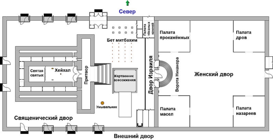Выше на уступе был устроен священнический двор с жертвенником всесожжения, каменными столбами с крюками для свежевания туш животных, мраморными столами для их разделки и бассейном с водой. Нижний и верхний дворы разделяла стена с воротами с обширным полукруглым крыльцом в 15 ступеней. За этими воротами вдоль огораживающей стены располагалась узкое, в десяток шагов пространство так называемого двора Израиля. Отсюда любой ритуально чистый иудей мог наблюдать за процессом жертвоприношения своего животного, дальше вглубь двора могли пройти только священники и прислуживающие им левиты.